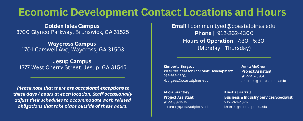 The Economic Development divison has offices on 3 campus locations in our service delivery area with several full-time staff members who are ready to assist you with your continuing education, business and industry, facility rental, and testing services needs. We can’t wait to help you!
