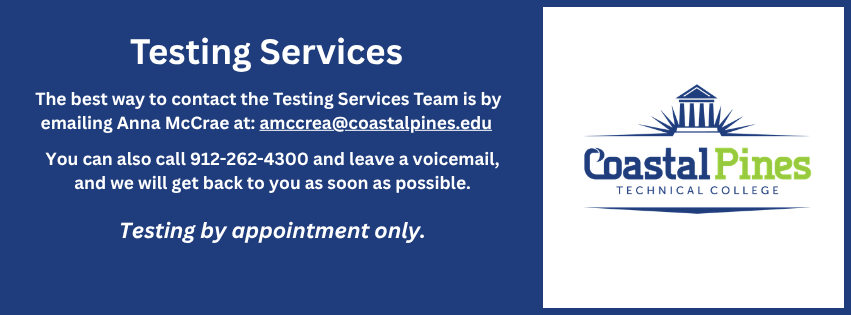Testing Centers at Coastal Pines Technical College are designed to meet the diverse assessment needs of our students and the surrounding community. The college offers a wide range of testing services to support career-focused education in a quiet, secure, and professional environment. Testing Centers are conveniently located on the Golden Isles, Jesup, Waycross, and Camden campuses, ensuring accessible services across the college’s service area. For questions about the testing centers or to request a new test to be administered, contact the Anna McCrea Testing Project Assistant.